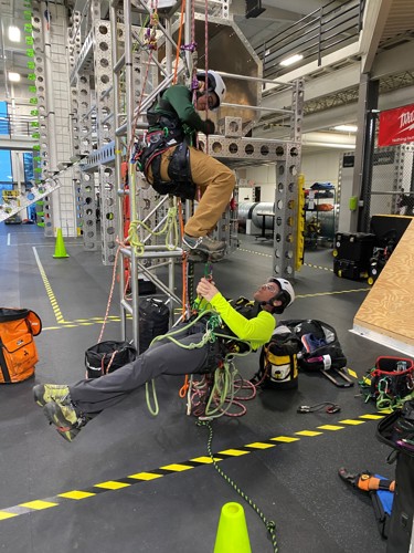 ENSA, an organization that provides work-at-height training and safety rigging services on metal structures, has been our partner in conceptualizing and bringing the indoor climbing center to life. ENSA primarily serves professionals who work at-height in wind power, telecommunications, and industrial markets, but has recently expanded its reach into arboriculture.
